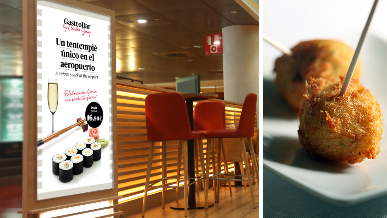 RESULTADO: La identidad visual creada para GASTROBAR by Carles Gaig logró su objetivo de acercar la alta gastronomía al gran público a través de una marca sofisticada y exclusiva que reflejaba la creatividad y calidad de la comida del Chef. La marca se integró con elegancia en el interiorismo del local, aportando un toque personal y exclusivo a la experiencia del cliente. El restaurante se destacó entre otros locales del aeropuerto, generando interés y atractivo para los clientes en busca de una experiencia gastronómica única.
